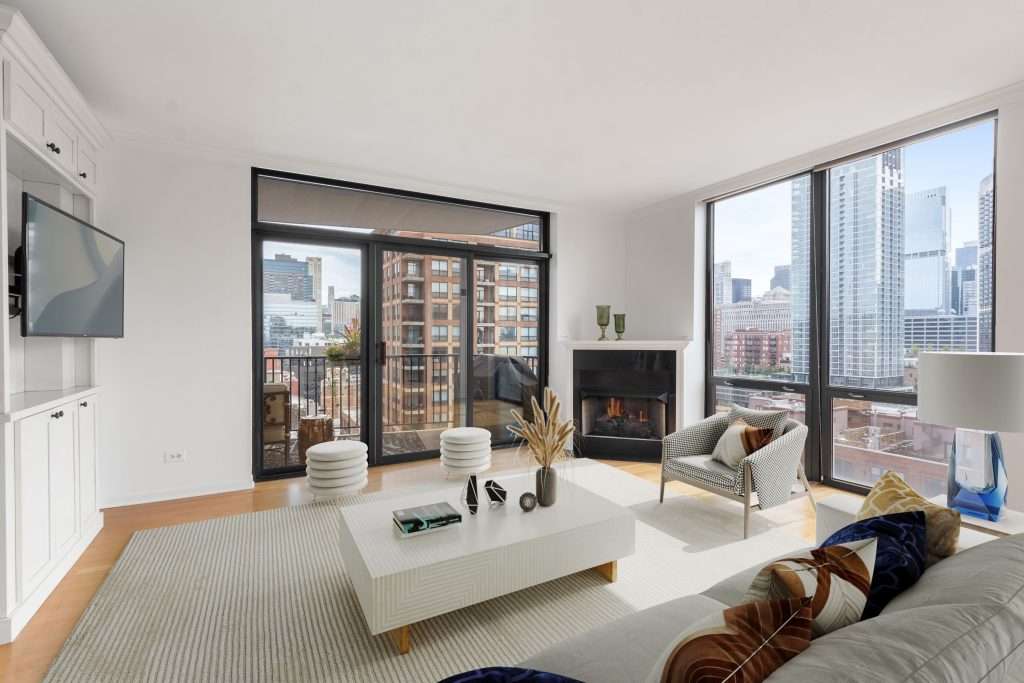 Experience breathtaking, unobstructed cityscape views through expansive floor-to-ceiling windows from this highly sought-after southeast-facing 14th floor residence at Erie Centre, located in Chicago’s River North neighborhood. This beautiful home includes a premium deeded two-car tandem parking space in the building’s attached, heated garage for ultimate convenience. With nearly every room flooded in natural light, this spacious 2-bedroom, 2-bath home has been thoughtfully designed for both comfort and style. The open-concept living and dining area showcases gleaming hardwood floors, a cozy gas fireplace, and a seamless flow that is perfect for entertaining or relaxing. The modern, updated kitchen is a chef’s delight with polished quartz countertops, a generous center island with seating, abundant cabinetry, and newer stainless steel appliances.